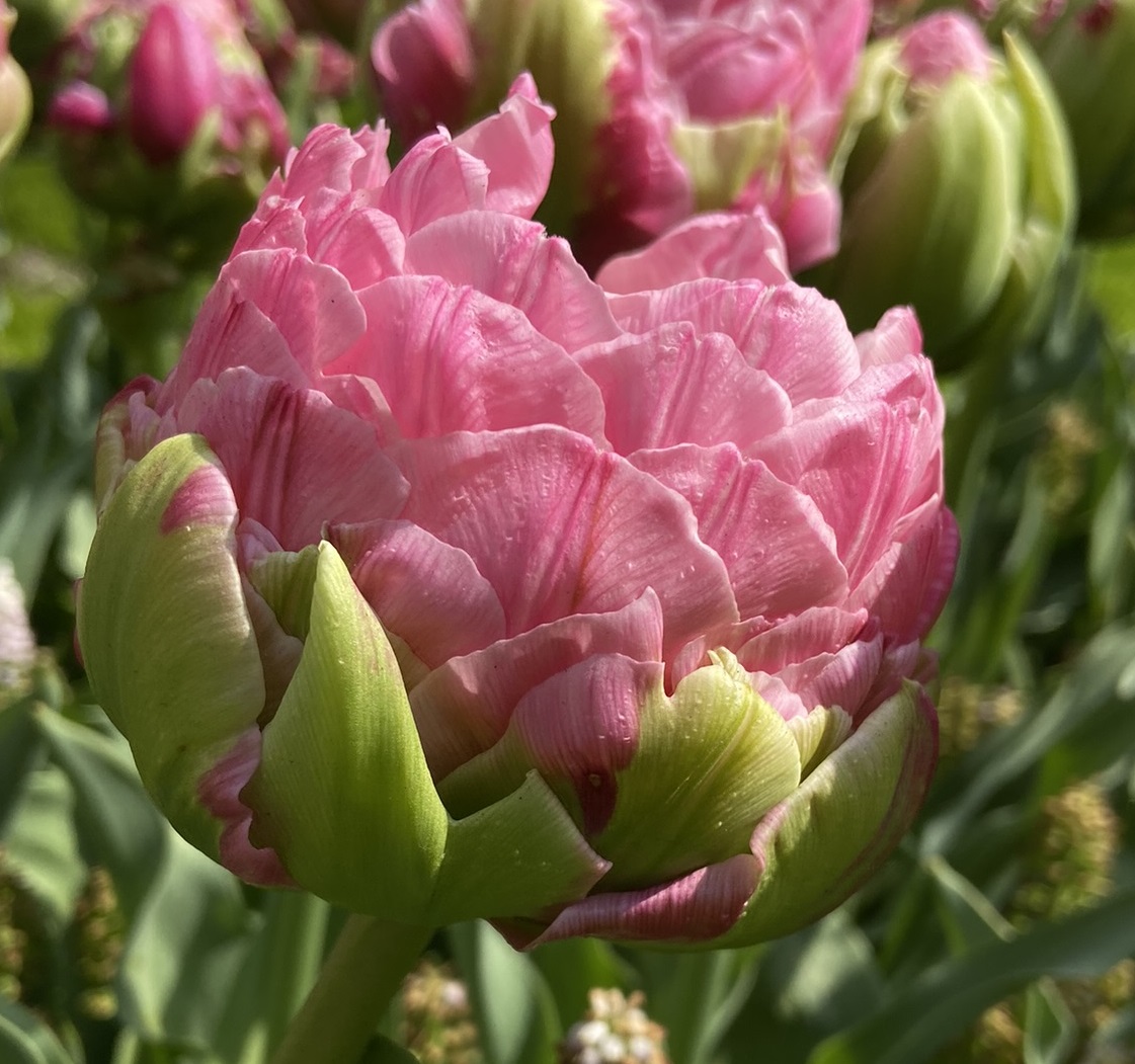 Tulipanen Strawberry Cream er en spektakulær og sjælden dobbelttulipan, der ligner en pæon med sine mange lag af lyserøde kronblade. Den blomstrer i midten til slutningen af foråret og bliver omkring 45 cm høj. Med sin fyldige form og romantiske farver er den perfekt til både haver og buketter, en ægte showstopper, der tilfører elegance og charme til enhver have.